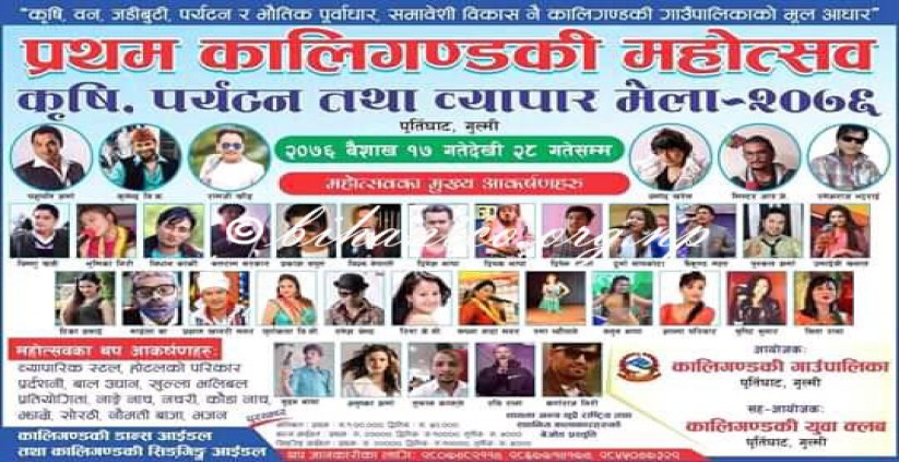 प्रेम पुन , पुर्तिघाट गुल्मी । ०६ वैशाख ०७६ । गुल्मीको कालीगण्डकी गाउँपालिकामा प्रथम कालीगण्डकी महोत्सव हुने भएको छ । कालीगण्डकी गाउँपालिकाको आयोजना तथा कालिगण्डकी युवा क्लव कालीगण्डकी गाउँपालिका वडा नम्बर ४ को सह–आयोजनामा पुर्तिघाटमा वैशाख १७ देखि २८ गतेसम्म प्रथम कालीगण्डकी महोत्सव, कृषि, पर्यटन तथा व्यापार मेला २०७६ संचालन हुन लागेको हो ।