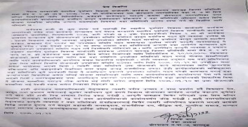 सिफारिस बिना निर्माण कार्य अघि बढाइएकोमा ढोरपाटन नगरपालिका–७ का वडा अध्यक्षद्धारा विज्ञप्ति
