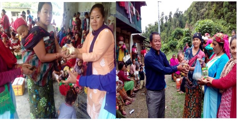 गाउँपालिका भित्राका ४५७ आमाहरुलाई २२८५ चल्ला र ९१४ केजि दाना र तरकारी बीउ वितरण गरिएको हो ।