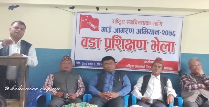 बागलुङ । २०७६ असोज १५ । राष्ट्रिय जनमोर्चा बागलुङले सञ्चालन गरेको राष्ट्रिय स्वाधीनताको लागि गाउँ जागरण अभियान जिल्लाका सबै नगरपालिका तथा गाउँपालिकामा विभिन्न टोली बनाएर टोली अनुसार भेला तथा प्रशिक्षण जारी रहेको छ ।