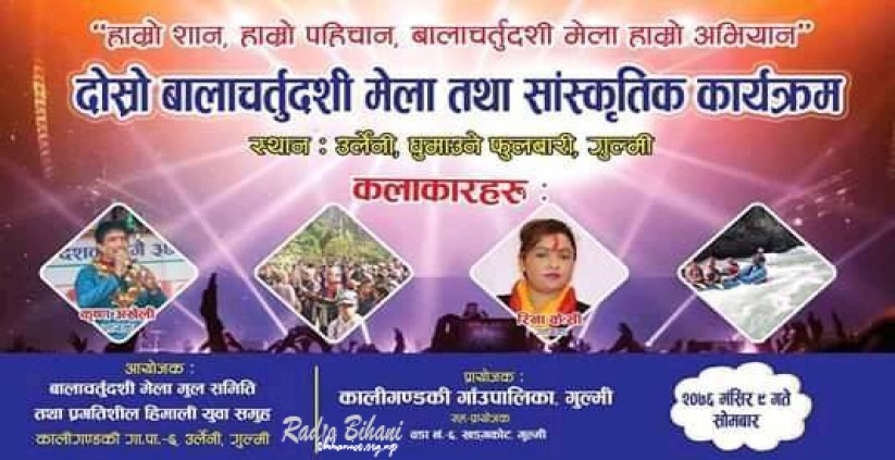 यस बर्षको बालाचतुर्दसी मेलामा चर्चित रास्ट्रीय कलाकारहरुको प्रस्तुति संगै पन्चेबाजा प्रतियोगिता, लोक सांस्कृतिक नृत्य प्रतियोगिता, भजन प्रतियोगिता लगायतका कार्यक्रमको आयोजना गरिएको छ । त्यस्तै सामुहिक सतबिज छर्ने कार्यक्रम र कालिगण्डकी नदीमा तोरण तार्ने कार्यक्रम पनि रहेको बालाचतुर्दसी मेला उत्थान समितिका अध्यक्ष कमल ज्ञवालीले जानकारी दिए ।