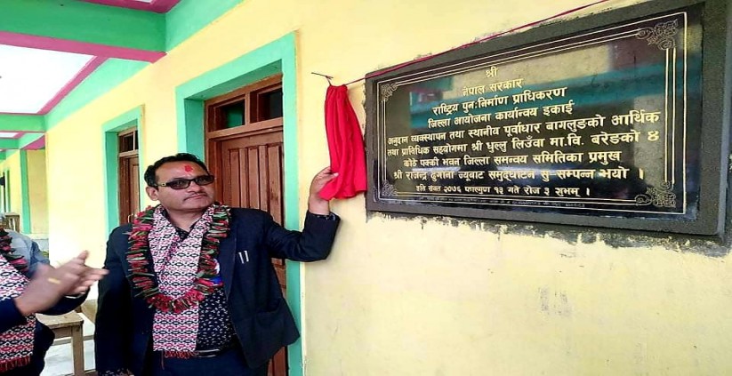 राष्ट्रिय पुनःनिर्माण प्राधिकरण जिल्ला आयोजना कार्यान्वयन इकाई (अनुदान व्यवस्थापन तथा स्थानीय पूर्वाधार) बागलुङबाट आर्थिक वर्ष २०७६।०७६ मा विनियोजित करिब ७० लाख रकम मध्येबाट ४ कोठे पक्की भवनको जिल्ला समन्वय समिति बागलुङका प्रमुख राजेन्द्र ढुङ्गानाले शिलालेख अनावरण गरि उद्घाटन गर्दै चाबी हस्तान्तरण गर्नुभयो ।