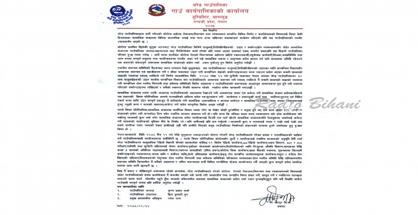 यसैबिच बरेङ गाँउपालिकाले सामाजिक सञ्जालमा फैलाईएको भ्रमकावारे थप स्पष्ट पार्न प्रेस बिज्ञप्ति जारि गरेको छ । गाँउपालिकाद्वारा बुधवार जारि प्रेस बिज्ञप्तिको पुर्ण पाठ यस्तो रहेको छ....