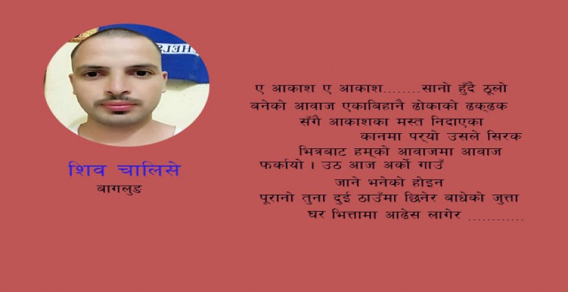 शिव चालिसे । २०७७ भाद्र १८ । ए अाकाश, ए अाकाश.... सानो हुँदै ठुलाे बनेकाे अावज एका बिहानै ढाेकाकाे ढ्कढ्क सँगै अाकाशका मस्त निदाएका कानमा पर्याे । उसले सिरक भित्रबाटै हम् काे अावाजमा अावाज फर्कायाे । उठ कति सुतेको अाज अर्को गाउँ जाने भनेको हैन । फेरि लल काे अावज भित्रबाटै अायाे । पुरानो तुना दुई ठाउँमा छिनेर बाधेकाे जुत्ता ,घरकाे भित्तामा अाढेस लागेर बसेकाले हाेला कालाे ज्याकेटमा सेताे कमेरो धसिएकाे थियाे । मैलो कमिज कलर हल्का फाटेकाे पाइन्टकाे पछि तिरकाे खल्तीकाे एक छेउमा थाेरै उद्रेकाे कपडामा केहिबेर कम्मल बाहिरै कुरेपछि अाकाश बाहिर निस्कियाे ।