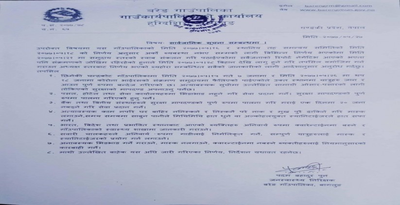 सुचनामा अनाबस्यक भिडभाड गर्ने गराउने माक्स नलगाउने ,क्वारेन्टाईनमा नबस्ने ब्यक्ति हरुलाई कार्बाही गर्ने बताईएको छ ।