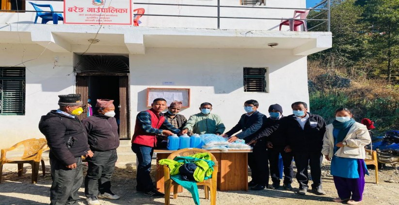 सोमबार बरेङ गाँउपालिकाको कार्यलय सुदालामा एक कार्यक्रमको आयोजना गरि स्यानिटाईजर १५ लिटर, माक्स ६ सय थान, ज्वरो नाप्ने थर्मलगन २ थान ,पिपिई ५ सेट, बरेङ गाँउपालिकाका अध्यक्ष कृष्ण प्रसाद शर्मा तथा प्रमुख प्रषाशकिय अधिकृत रमेस थापालाई हस्तान्तरण गर्नुभएको हो ।