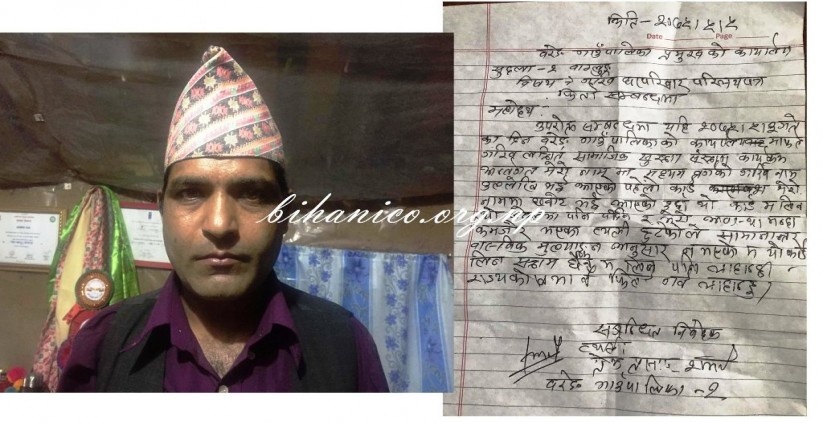 प्रकाश छन्त्याल, बरेङ । ०५ भाद्र २०७५ । बागलुङको बरेङ गाउँपालीका वडा नम्वर २ हुग्दिशिरका प्रेम प्रशाद शर्माले नेपाल सरकारले गरिब घरपरिवार पहिचान गरी वितरण गरेको परिचय पत्र फिर्ता गरेका छन् । शर्माले गाउँपालिकाका अध्यक्ष कृष्ण प्रसाद शर्मा र रेडियो बिहानीका स्टेशन कोअर्डिनेटर प्रकाश छन्त्यालको रोहबरमा परिचयपत्र फिर्ता लैजान भनी गाउँपालीकामा निबेदनका साथ पेश गर्नुभएका हो ।