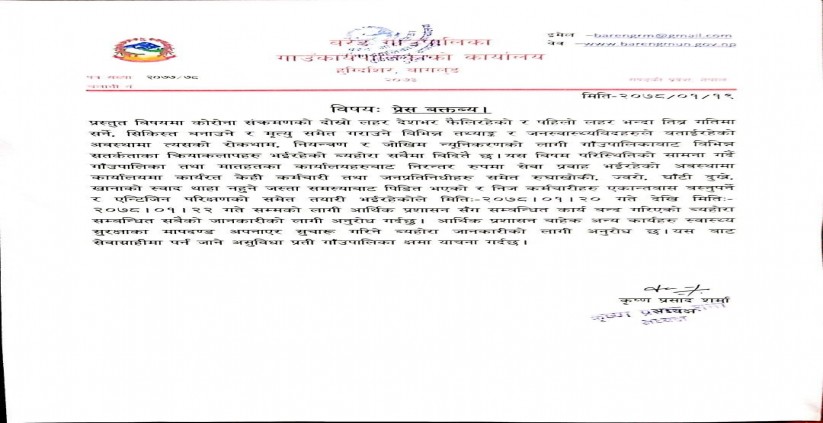 कार्यलयमा कार्यरत केहि कर्मचारीहरु रुघाखोकी ,घाटि दुख्ने, ज्वरो आउने, खानाको स्वाद तथा गन्ध थाहा नहुने जस्ता समस्याबाट पिडित भएपछि कर्मचारी हरु एकान्त बासमा बस्नु पर्ने भन्दै यहि बैशाख २२ गते सम्मका लागी आर्थिक आर्थिक प्रशासन शाखा बन्द भएको छ । लक्षण देखिएका कर्मचारी को एन्टीजेन परिक्षणको तयारी समेत भैरहेको पालिकाले आईतबार साँझ बिज्ञप्ती मार्फत जानकारी दिएको छ । अन्य शाखा भने सुरक्षाका मापदण्ड अपनाइ खुल्ला रहने जनाइएकाे छ ।