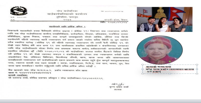 जहाँबाट भए पनि नगद, स्वास्थ्य सामग्री, राहत सामग्री (मास्क, सेनिटाइजर, पि.पि.इ तथा दाल, चामल नुन, तेल जस्ता खाद्य सामग्रीहरु) जे सकिन्छ त्यही सहयोग गर्नका लागि अनुरोध गर्दै सम्पर्क व्यक्तिकोे रुपमा पालिकाका प्रशासन अधिकृतलाई कोभिड समन्वय अधिकृतको जिम्मा दिईएको पालिकाले बताएको छ ।