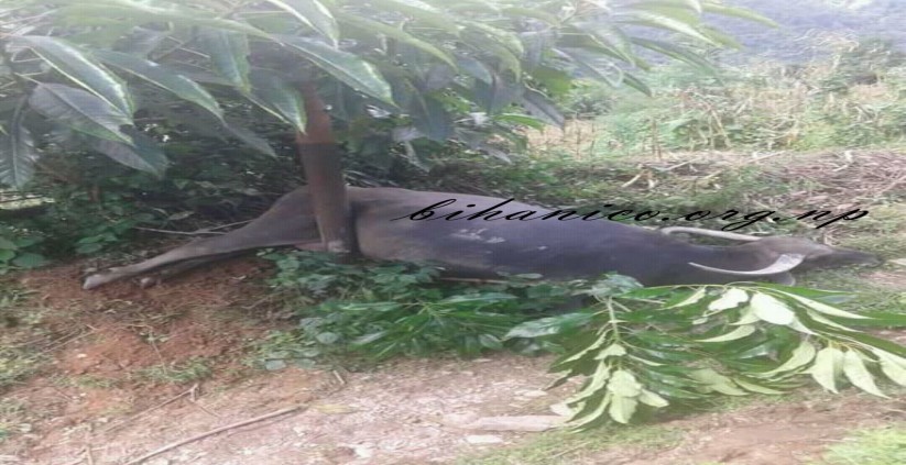 स्थानिय स्यामलाल शर्माको दुहोनो भैसी सोमबार करिब मध्यान १२ बजेको समयमा विद्युतको पोलमा टाँसिदा मृत्यू भएको हो । घर नजिकैको पोखरीमा पानी खाएर गोठमा फर्किने क्रममा फलामको पोलमा टाँसिएर मृत्यु भएको त्यहाँबाट युवराज सापकोटाले जानकारी दिए ।