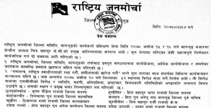 जिल्ला समिति बागलुङको तर्फबाट प्रस्तुत संगठनात्मक कार्ययोजना, आर्थिक कार्ययोजना र संघर्षका कार्यक्रम सम्बन्धि प्रस्ताव छलफल सहित पारित गर्दै गणतन्त्र, राष्ट्रिय स्वाधीनताको रक्षा र संघीयताको खारेजीका लागि संघर्षका विभिन्न कार्यक्रमहरु सञ्चालन गर्ने जिल्ला सचिव भिमलाल पोखरेलले बताउनुभयो । यहि असोज २० गते जिल्लाका ५२ स्थानमा एमसीसीको विरोध र व्यथिति, महंगी, अनियमिता, भ्रष्टाचार, विभेदकारी गतिविधीको भण्डाफोर लगाएतका विषयमा कार्यक्रम गर्नका लागि स्थान सहित प्रमुख वक्ता वक्तव्य मार्फत सार्वजनिक गरिएको छ ।