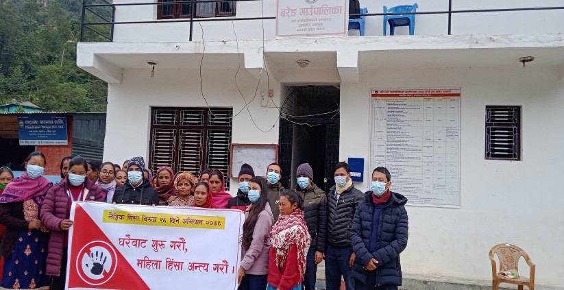 १६ मङ्सिर ०७८ । हुग्दिशिर । नोभेम्बर २५ देखि डिसेम्बर १० सम्म महिलाहिंसा विरुद्ध १६ दिने अभियान संचालन भए सङ्गै बरेङ गाउँपालिकामा बिहिबार एक कार्यक्रम गरि हिंसा अन्त्यको सन्देश प्रवाह गरिएको छ ।