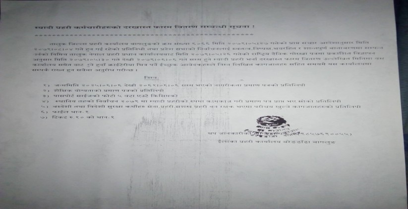 दर्खास्त फारमको साथमा शैक्षिक योग्यताको प्रमाण पत्रको प्रतिलिपि,पासपोर्ट साईजको एकै किसिमको फोटो ५ प्रति,स्थानिय तहको निर्वाचन २०७९ मा म्यादि प्रहरीमा कार्य गरेको भए सोको प्रमाण पत्रको प्रतिलिपि,स्वदेसि तथा बिदेशि सुरक्षाकर्मिहरु,सेना प्रहरी,शसस्त्र प्रहरी,बन रक्षक,भएमा परिचय खुल्ने कागजातहरुको प्रतिलिपि,फाईल १ थान टिकट रु १० को १ थान आबस्यक पर्ने सुचनामा उल्लेख गरिएको छ ।
