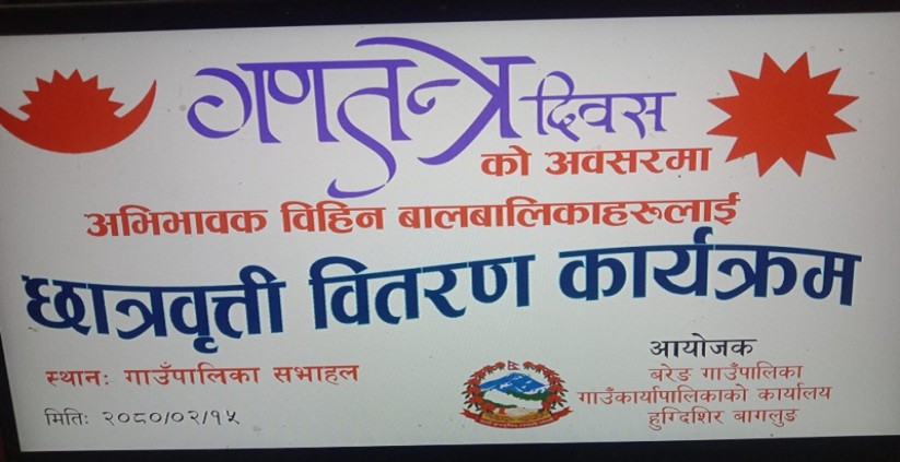 बागलुङको बरेङ गाउँपालिकाले पनि अभिभावकविहिन बालबालिकाहरुलाई छात्रवृत्ति वितरण गरी गणतन्त्र दिवस मनाएको छ ।