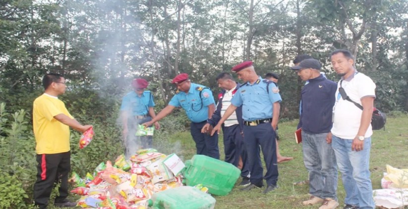 म्याद गुर्जेका खाद्य वस्तुहरु कुरकुरे ४९ पोका, खाने तेल ९१ पोका, सुजी ३८ पोका, आलु चिप्स १३ पोका, म.म. मसला ८ पोका, भुजा २६ पोका, वेसन २३ पोका, पापड १ पोका, भेनेगर १ बोटल (९५०मिलि), क्रयाकर चिप्स ३९ पोका, फुरन दाना १० पोका, बिस्कुट ७ पोका, लालि चाउचाउ (पिरो) २० पोका, दालमोट १ पोका र काजु ३ पोका नष्ट गरिएको छ ।