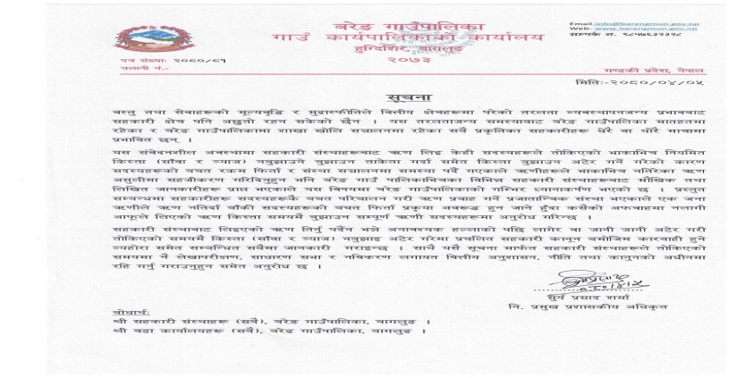 साथै सहकारी संस्थाबाट लिएको ऋण तिर्नपर्दैन भन्ने अनावश्यक हल्लाको पछि लागेर वा जानी जानी अटेर गरी तोकिएको समयमै किस्ता नबुझाइ अटेर गरेमा प्रचलित सहकारी कानुन बमोजिम कारवाहि गर्ने गाउँपालिकाले चेतावनी दिएको छ ।साथै सहकारी संस्थाहरुलाइ तोकिएको समयमै लेखा परिक्षण, साधारण सभा, नविकरण लगायत वित्तिय अनुशासन र निति अवलम्वन गर्न पनि अनुरोध गरेको छ ।