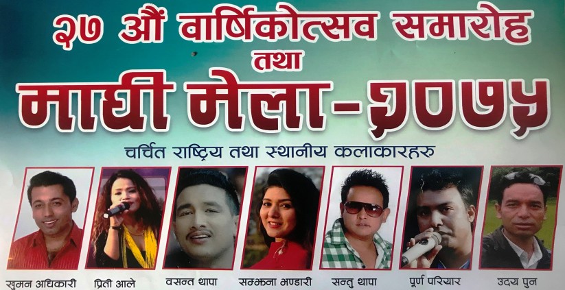 “परम्परागत स्थानिय संस्कृतिको संरक्षण गरौं, शिक्षा तथा खेलकुद बिकास संगै कृषि प्रबद्र्धन गरौं” भन्ने मुल नाराका साथ यहि पौष २८ गते देखि माघ २ गतेसम्म आयोजना गरिएको कार्यक्रममा बिबिध खेलकुद एवं शैक्षिक तथा मनोरञ्जनात्मक कार्यक्रमहरुको आयोजना गरिएको छ ।